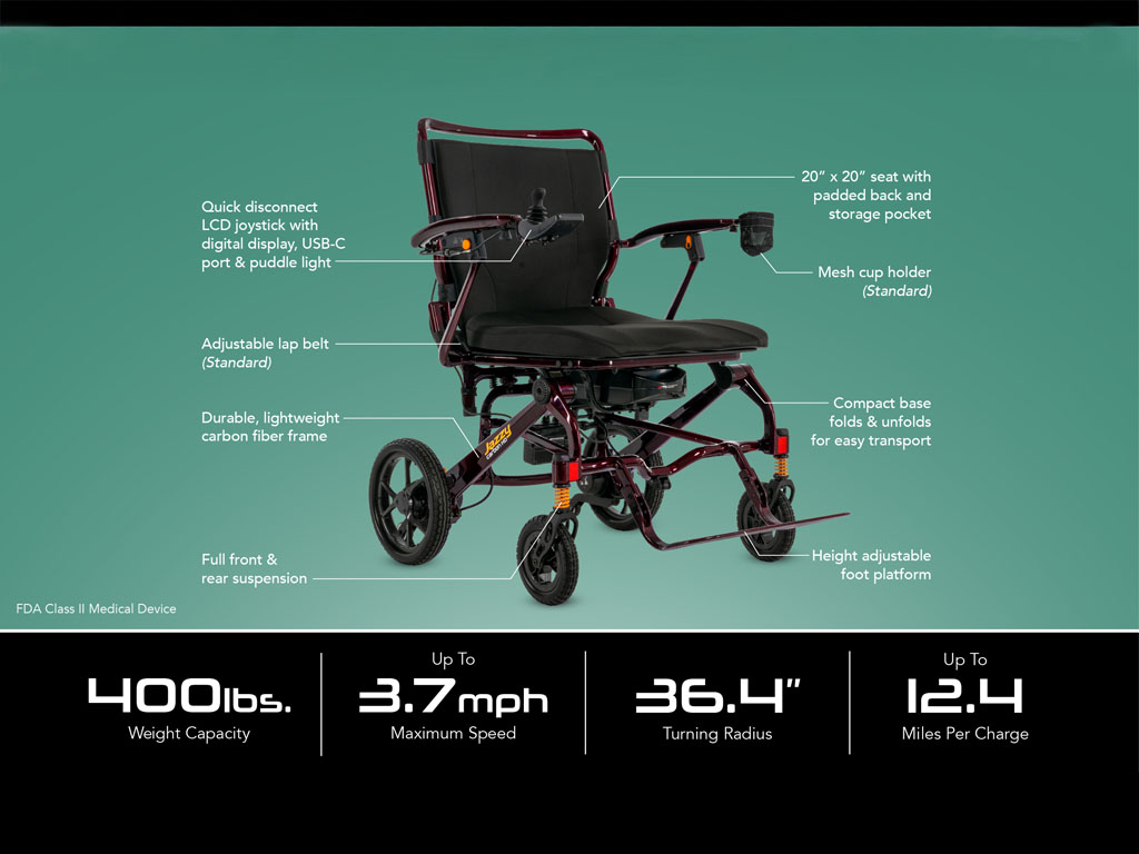 The Jazzy® Carbon HD balances high-strength performance with effortless portability. Below are the technical specifications and comfort features that make this chair a standout choice for active users.